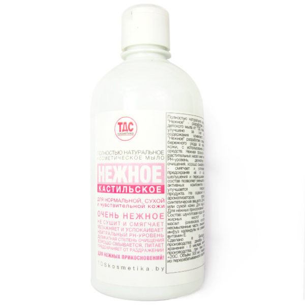 Полностью натуральное, жидкое мыло «Нежное: кастильское» — разработано на основе детского мыла от «ТДС косметика» (заменило его в ассортименте продукции), оно улучшено за счёт увеличения содержания оливкового масла. «Нежное» разработано специально для бережного ухода за чувствительной кожи, с использованием безопасных средств. Нежная формула на основе растительных масел имеет нейтральный PH-уровень, деликатную степень очищения, хорошо смывается, не сушит — смягчает и успокаивает кожу, предохраняя её от раздражений, шелушения и пересушивания. Простой состав позволяет уменьшить количество активных компонентов, и этим улучшается гипоаллергенность продукта. Не содержит красителей, ароматизаторов, вредных и синтетических веществ. Для нормальной или сухой кожи. Без ароматизаторов. Для лица и для тела. Для нежных прикосновений!